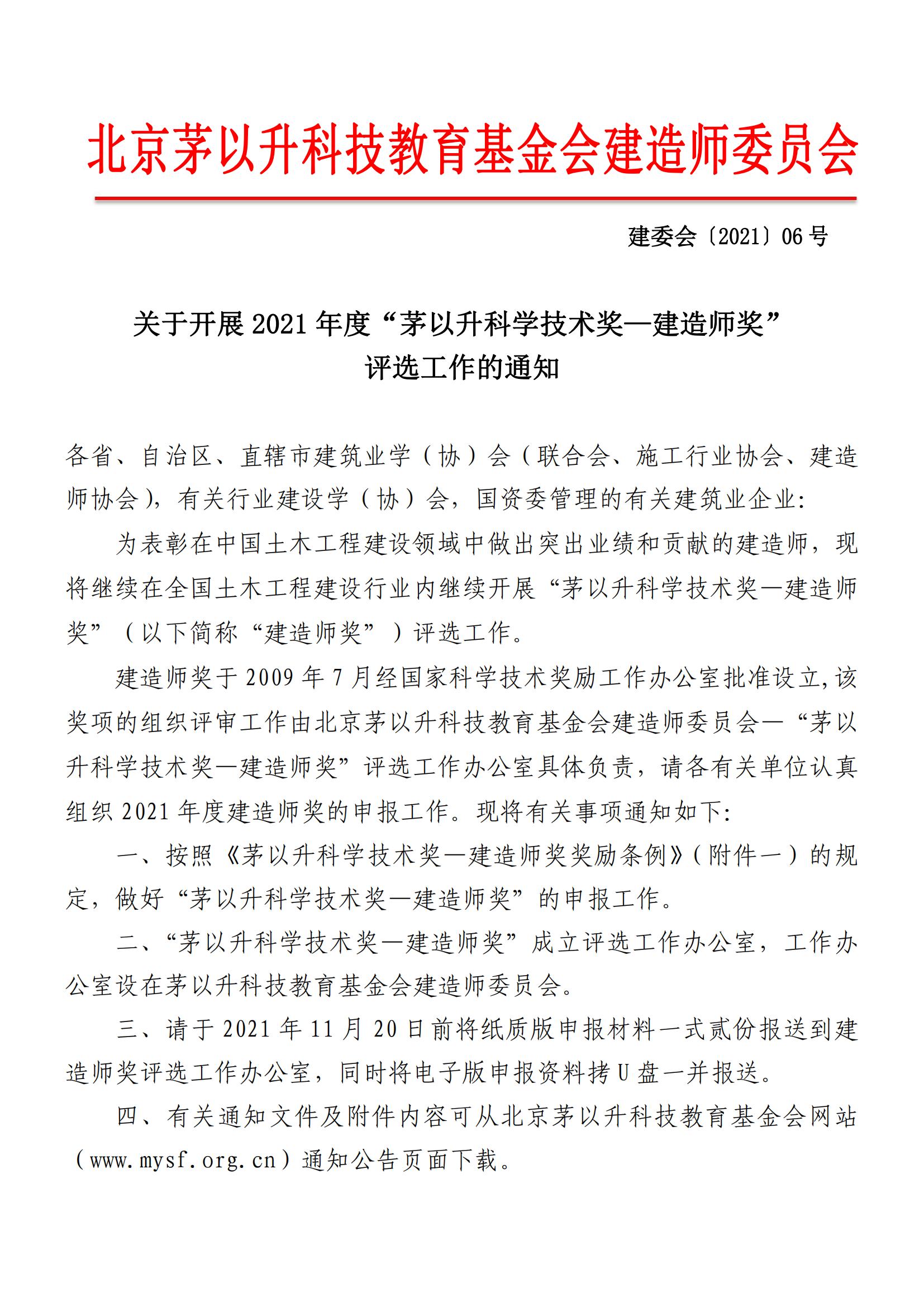 現轉發“關(guan) 於(yu) 開展 2021 年度‘茅以升科學技術獎—建造師獎’評選工作的通知”,請有意向申報的個(ge) 人參閱通知詳情申報,如需推薦,請提前與(yu) 我學會(hui) 聯係,並於(yu) 11月15日前將申報材料(紙質版、電子版)交至學會(hui) 秘書(shu) 處,我學會(hui) 將按推薦要求統一提交推薦申報材料。