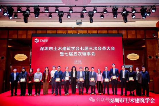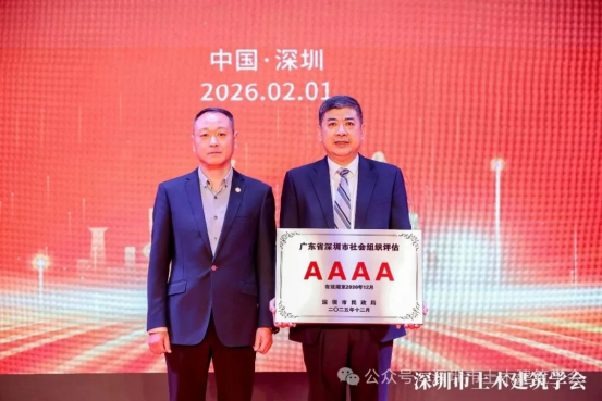 學會(hui) 榮譽環節,首先由廖凱理事長、劉福義(yi) 秘書(shu) 長為(wei) 榮獲“中國土木工程詹天佑獎優(you) 秀住宅小區金獎”的華章新築保障性住房項目相關(guan) 會(hui) 員單位頒發證書(shu) ,該項目由我會(hui) 員單位中海建築有限公司、深圳市安居集團、奧意建築工程設計有限公司、香港華藝設計顧問(深圳)有限公司設計、建設。隨後,社會(hui) 組織總會(hui) 蘇建東(dong) 執行會(hui) 長為(wei) 我學會(hui) 授予了2025年度市級社會(hui) 組織4A級學會(hui) 牌匾,由廖凱理事長代表學會(hui) 領牌。