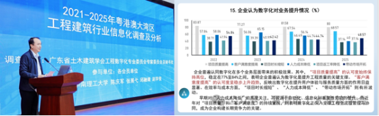 隨後,廣東(dong) 省土木建築學會(hui) 工程數字化專(zhuan) 委會(hui) 副主任委員陳慶軍(jun) 就《2021-2025年粵港澳大灣區工程建築行業(ye) 信息化調查及分析》進行專(zhuan) 題分享。他圍繞調查核心內(nei) 容,從(cong) 企業(ye) 基本信息、企業(ye) 信息化建設現狀、大灣區建築行業(ye) 信息化相關(guan) 問題、大灣區建築行業(ye) 人工智能使用情況四大關(guan) 鍵維度進行拆解、分析和解讀,並結合調查結果進行總結提升,提出針對性優(you) 化建議,為(wei) 大灣區工程建築行業(ye) 信息化高質量發展提供了重要的數據支撐和實踐指引。