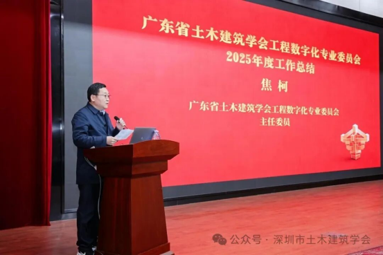 首先,廣東(dong) 省土木建築學會(hui) 工程數字化專(zhuan) 委會(hui) 主任委員焦柯率先發表工作總結講話。他代表專(zhuan) 委會(hui) ,向一年來辛勤付出的全體(ti) 委員、鼎力支持的各參與(yu) 單位及各界同仁表示誠摯感謝,全麵回顧了2025年專(zhuan) 委會(hui) 在黨(dang) 建引領、組織建設、行業(ye) 服務、協同合作四大方麵取得的豐(feng) 碩成果,重點提及開展行業(ye) 信息化調查、編撰數字化年刊、舉(ju) 辦品牌論壇及推進人才培養(yang) 等重點工作。同時,焦柯主任也正視當前工作存在的短板,明確2026年專(zhuan) 委會(hui) 將聚焦完善工作機製、深化行業(ye) 研究、創新活動形式、拓展合作領域、強化人才培養(yang) 五大重點任務,持續發揮橋梁紐帶作用,助力行業(ye) 實現高質量數字化轉型。
