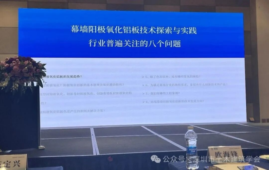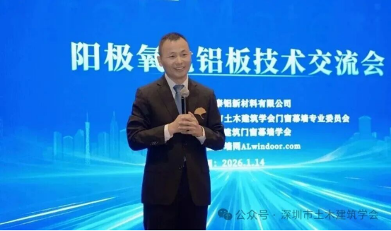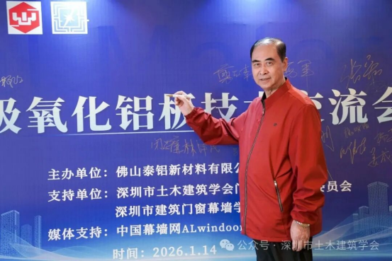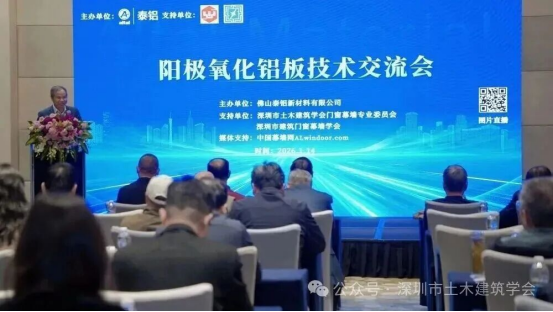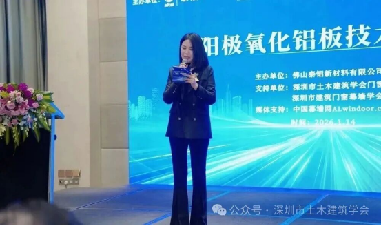 2026年1月14日下午,由佛山泰鋁新材料有限公司主辦,bv伟德体育官方网站門窗幕牆專(zhuan) 業(ye) 委員會(hui) 和深圳市建築門窗幕牆學會(hui) 支持舉(ju) 辦的泰鋁陽極氧化鋁板技術交流會(hui) 在深圳益田威斯汀酒店圓滿召開。bv伟德体育官方网站常務副理事長兼秘書(shu) 長劉福義(yi) 、bv伟德体育官方网站門窗幕牆專(zhuan) 業(ye) 委員會(hui) 總顧問薑成愛、深圳市建築門窗幕牆學會(hui) 名譽會(hui) 長杜繼予、bv伟德体育官方网站門窗幕牆專(zhuan) 業(ye) 委員會(hui) 主任花定興(xing) ,以及深圳市綠色建築協會(hui) 理事長剪愛森、深圳市建築裝飾協會(hui) 門窗幕牆專(zhuan) 業(ye) 委員會(hui) 副會(hui) 長兼秘書(shu) 長周瑞基等多位深圳門窗幕牆領域的領導、專(zhuan) 家、資深學者、設計和技術管理人員70餘(yu) 人出席本次活動。