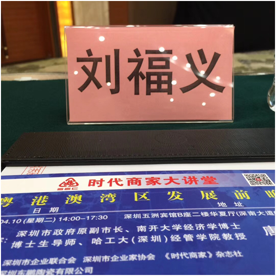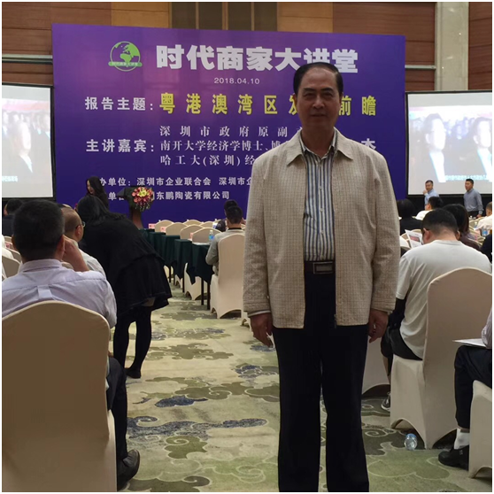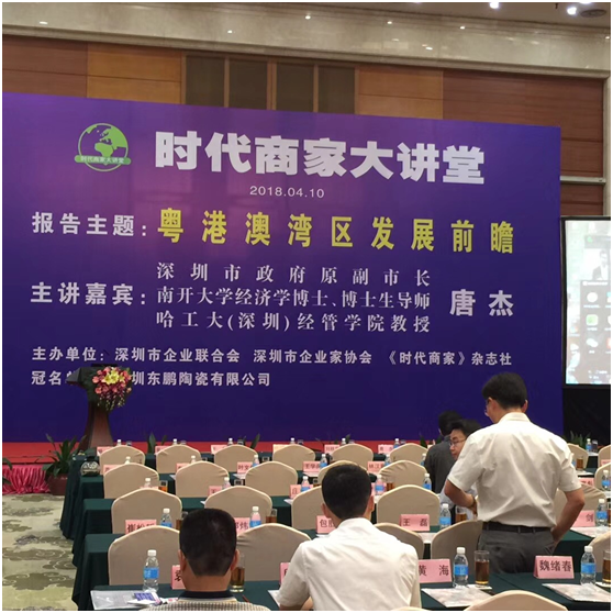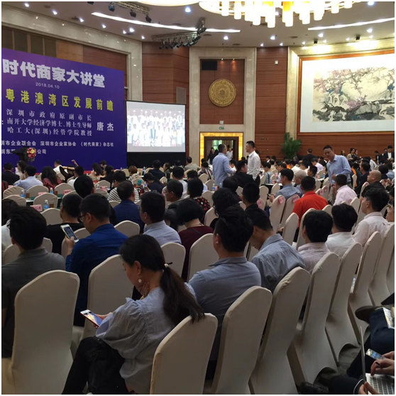 2018-4-10,由深圳市企企業(ye) 家聯合會(hui) 、企業(ye) 家協會(hui) 、時代商家雜誌社舉(ju) 辦的“時代商家大講堂在深圳五洲賓館舉(ju) 行。會(hui) 議由執行會(hui) 長於(yu) 劍主持,深圳市原付市長唐傑博士主講粵港澳灣區發展前瞻,深圳市部分老領導和300多位企業(ye) 家出席會(hui) 議。