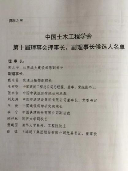 2018-6-1/3北京,中國土木工程學會(hui) 第十次全國會(hui) 員代表大會(hui) 在北京國誼賓館舉(ju) 行,建設部老領導薑偉(wei) 新部長、仇保興(xing) 付部長、齊驥付部長、郭允衝(chong) 付部長蒞臨(lin) 大會(hui) ,郭允衝(chong) 付部長當選為(wei) 理事長,李明安當選為(wei) 秘書(shu) 長。全國有30項工程榮獲詹天佑大獎。來自全國的科研、設計、高校、央企的領導和代表500餘(yu) 人出席會(hui) 議。