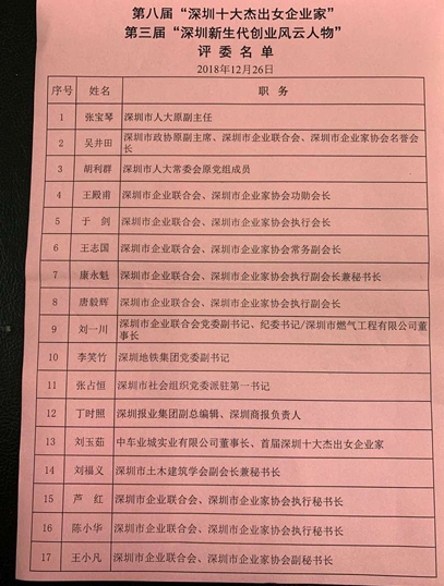 2018年12月26日,深圳市第八屆“深圳十大傑出女企業(ye) 家”和第三屆“深圳新生代創業(ye) 風雲(yun) 人物”評審會(hui) 在萬(wan) 德諾富特酒店多功能廳舉(ju) 行。於(yu) 劍執行會(hui) 長致歡迎詞、王誌國付會(hui) 長介紹曆年評審情況、康永魁秘書(shu) 長主持評審、王小凡付秘書(shu) 長介紹侯選人情況。經過全體(ti) 評委的認真討論,最後評出10名“深圳十大傑出女企業(ye) 家”和33名“深圳新生代創業(ye) 風雲(yun) 人物”。