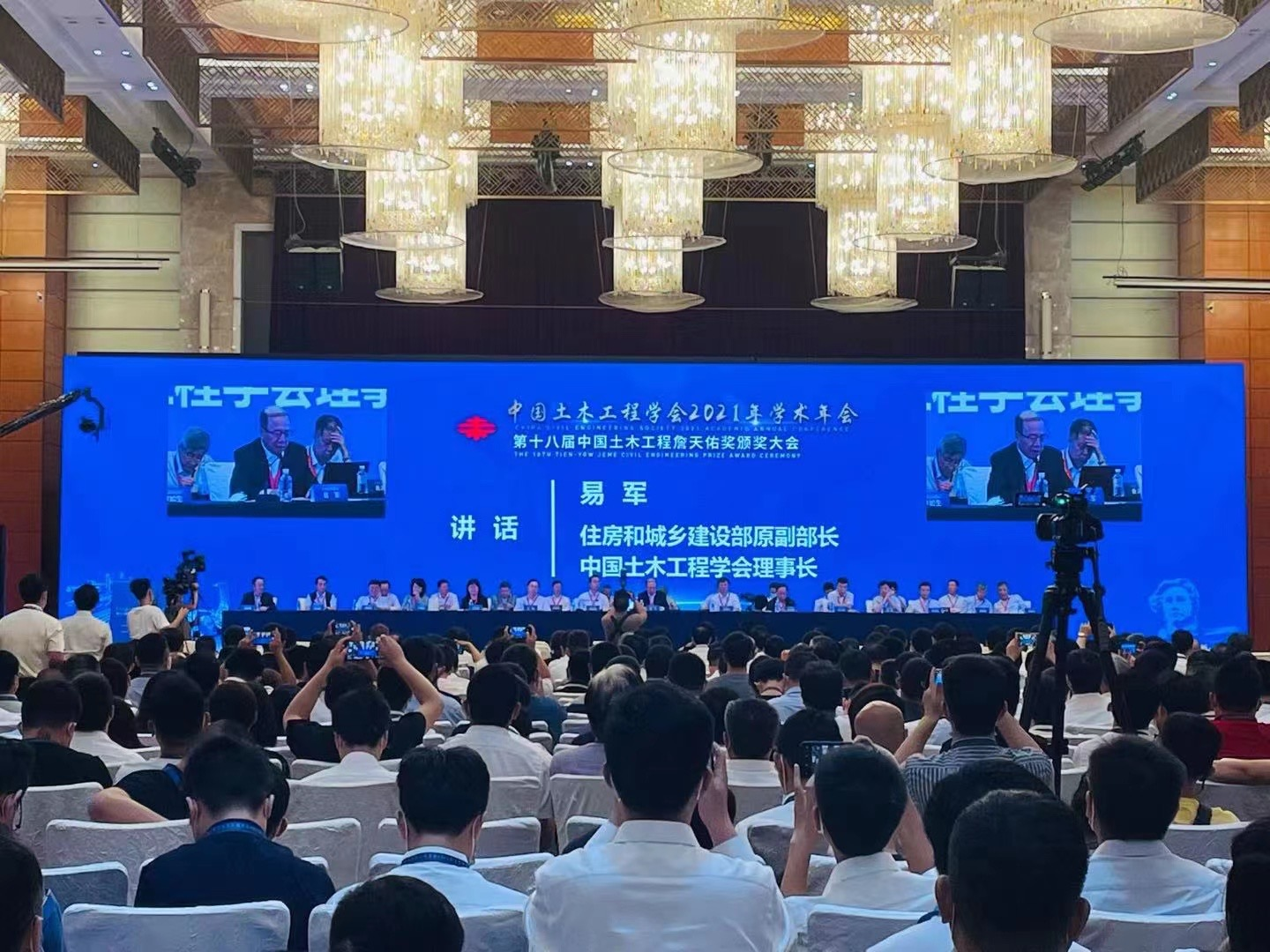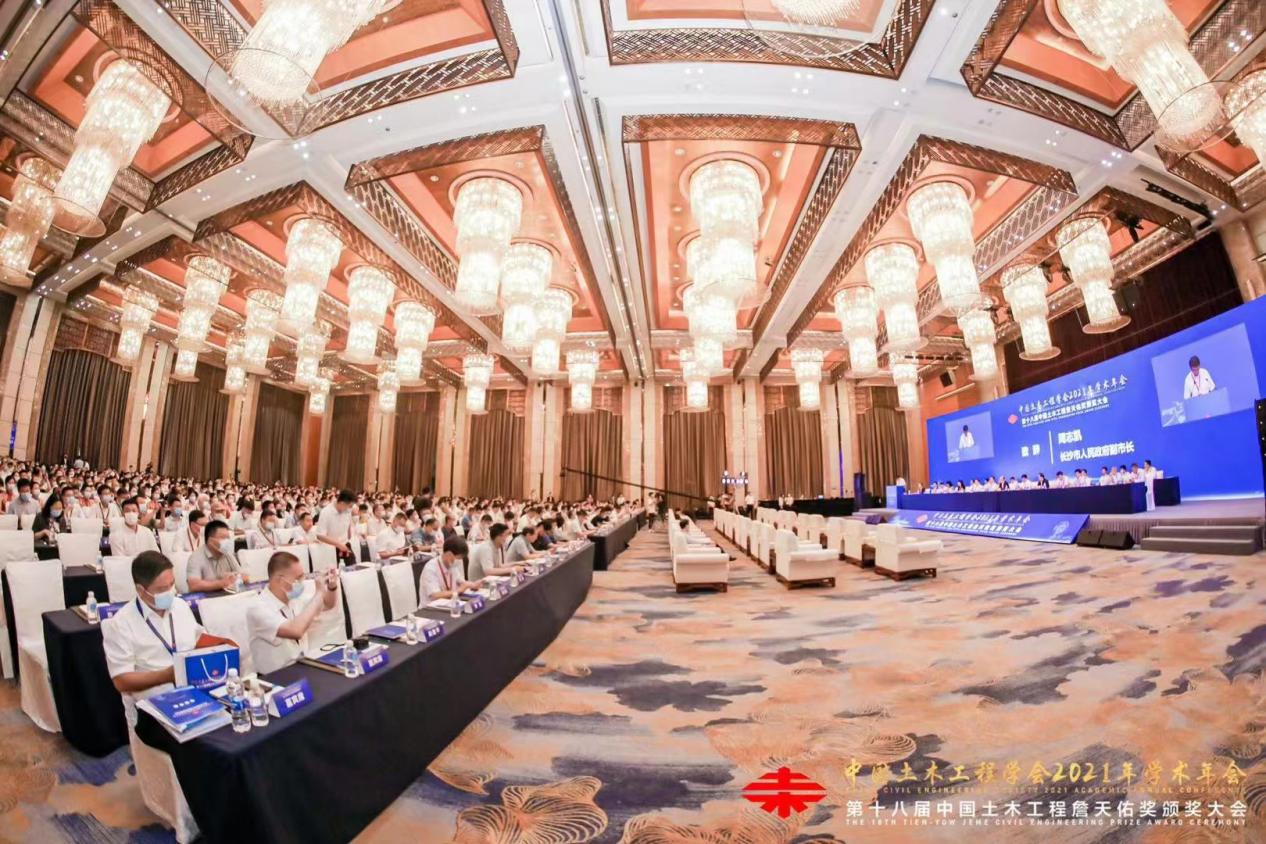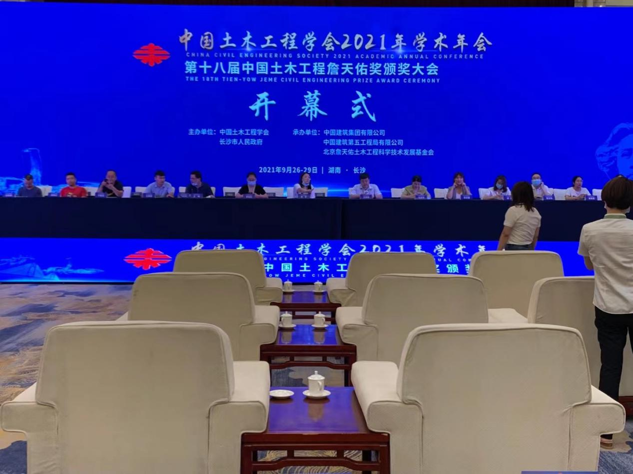 2021-9-27-29日,中國土木工程學會(hui) 學術年會(hui) 與(yu) 第十八屆中國土木工程詹天佑獎頒獎大會(hui) 在湖南長沙市世紀金源大飯店舉(ju) 行。會(hui) 議由中國土木工程學會(hui) 和長沙市政府共同主辦,中建總公司承辦。開幕式由中國土木工程學會(hui) 付理事長尚春明主持。長沙市付市長周誌凱、湖南省付省長陳文浩、住建部總工程師李如生、學會(hui) 理事長易軍(jun) (住建部原付部長)分別講話。學術報告分別由聶建國院士、盧春房院士、王同軍(jun) 付理事長主持。來自全國科研、高校、建設、施工、政府有關(guan) 專(zhuan) 家、教授、嘉賓共計1200餘(yu) 人現場出席會(hui) 議。規模宏大,盛況空前。