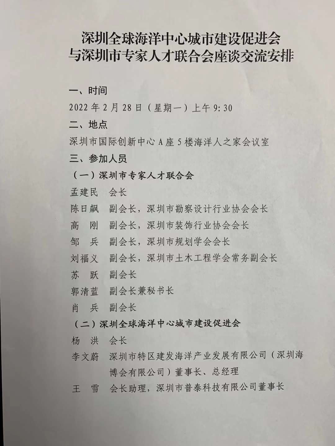 2022-2-28,孟建民院士帶領專(zhuan) 家人才聯合會(hui) 部分付會(hui) 長,拜訪了深圳全球海洋中心城市建設促進會(hui) ,受到楊洪會(hui) 長(深圳市委原常委)和秘書(shu) 處全體(ti) 同誌的熱情接待。大家交流了學會(hui) 工作的經驗和難點。共同表示齊心協力為(wei) 粵港澳大灣區的建設和發展做出更大的貢獻。