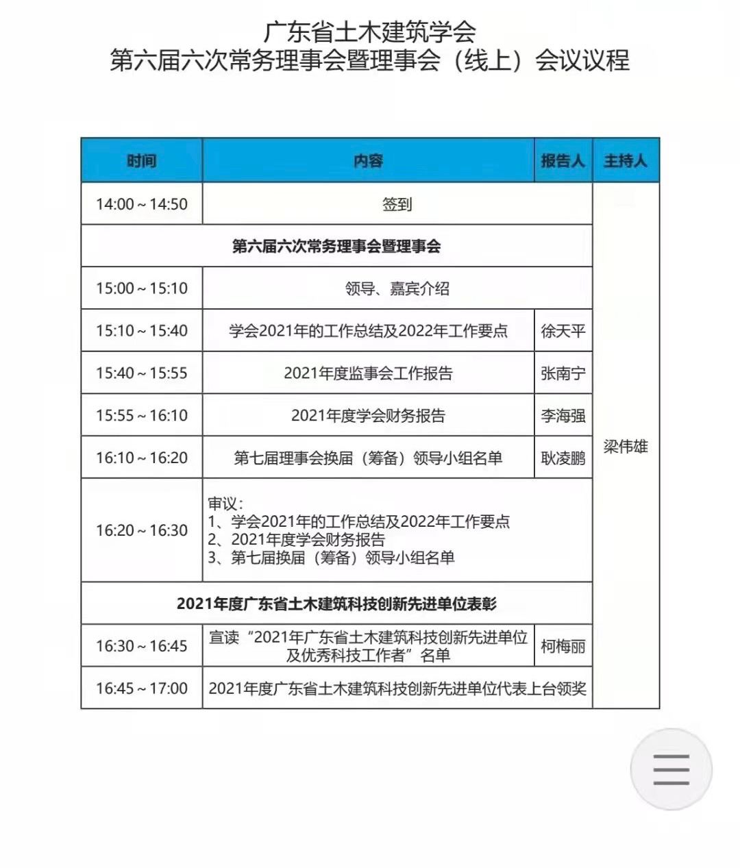 2022年3月25日,廣東(dong) 省土木建築學會(hui) 六屆六次常務理事會(hui) 在廣州廣東(dong) 大廈三樓國際會(hui) 議廳順利召開。受疫情影響,本次會(hui) 議采用線下和線上相結合的方式舉(ju) 行。