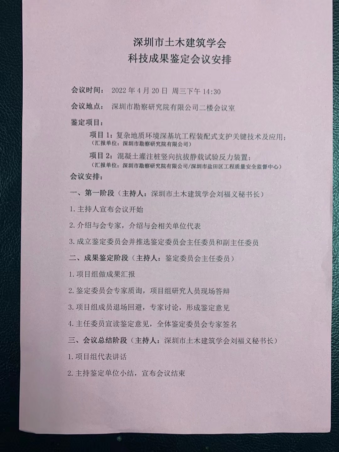 2022年4月20日,受深圳市科技中介同業(ye) 公會(hui) 委托,bv伟德体育官方网站在深圳市勘察研究院有限公司二樓會(hui) 議室主持召開了科技成果鑒定會(hui) ,鑒定項目:“深基坑工程裝配式支護關(guan) 鍵技術研究及應用”(完成單位:深圳市勘察研究院有限公司)與(yu) “混凝土灌注樁豎向抗拔靜載試驗反力裝置”(完成單位:深圳市勘察研究院有限公司、深圳市鹽田區工程質量安全監督中心、深圳市福田建設工程質量檢測中心、深圳市建研檢測有限公司)。