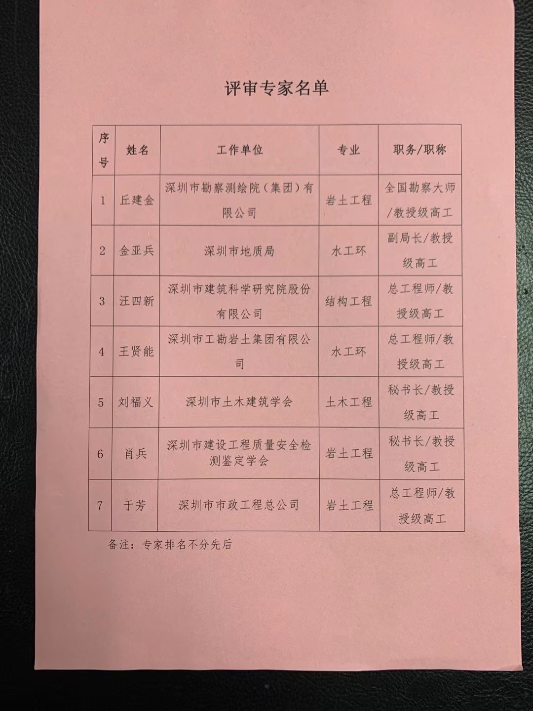 深圳市勘察測繪院有限公司首席專(zhuan) 家、全國勘察大師丘建金(教授級高級工程師);廣東(dong) 省深圳市地質局副局長金亞(ya) 兵(教授級高級工程師);深圳市建築科學研究院股份有限公司專(zhuan) 業(ye) 總工汪四新(教授級高級工程師);深圳市工勘岩土集團有限公司總工程師王賢能(教授級高級工程師);bv伟德体育官方网站秘書(shu) 長劉福義(yi) (教授級高級工程師);深圳市建設工程質量安全檢測鑒定學會(hui) 秘書(shu) 長肖兵(教授級高級工程師);深圳市市政工程總公司總工程師於(yu) 芳(教授級高級工程師)等單位的領導及行業(ye) 權威專(zhuan) 家應邀參與(yu) 成果鑒定,bv伟德体育官方网站副秘書(shu) 長申文娟;深圳市鹽田區工程質量安全監督中心造價(jia) 部(總工辦)副部長王光輝;深圳市勘察研究院有限公司總經理蔣鵬、技術中心經理餘(yu) 成華、薑岩、周禹熹等出席會(hui) 議。