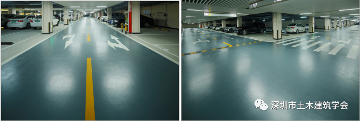 地下室車庫環氧地坪漆平整堅實,色澤一致,界麵清晰,車位劃線合理清晰;