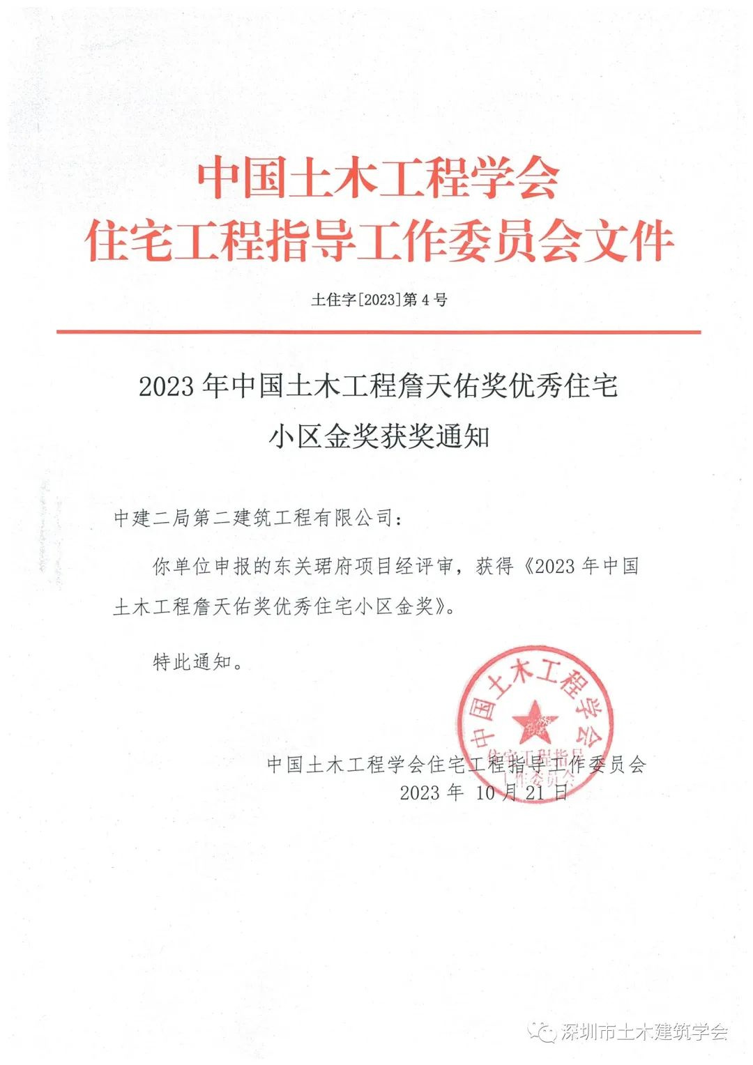 近日,由中國土木工程學會住宅工程指導工作委員會評選的《2023年中國土木工程詹天佑獎優秀住宅小區金獎》已公布結果,由中建二局第二建築工程有限公司承建的東關珺府憑借其在規劃、建築設計、環境設計、科技應用和工程質量等方麵的卓越表現,從全國上百個入圍項目中成功突圍,斬獲“2023年中國土木工程詹天佑獎優秀住宅小區金獎”,成為坪山曆史上首個榮獲“詹天佑獎優秀住宅小區金獎”的住宅項目。中國土木工程詹天佑獎設立於1999年,是一項跨鐵路、水利、交通、大型公用與民用建築各領域的重要獎項,也是中國土木工程領域工程建設項目科技創新的最高榮譽獎。該獎項每年評選一次,旨在弘揚科技創新精神,主要授予在科技創新(尤其是自主創新)和新科技應用方麵成績顯著的優秀土木工程建設項目,獲獎項目充分體現“創新性”“先進性”和“權威性”。詹天佑獎優秀住宅小區金獎是詹天佑係列獎項的重要組成部分,評審內容含規劃、建築設計、環境設計、科技應用和工程質量等,獲獎項目代表了中國住宅建設的先進水平。東關珺府能榮獲此殊榮,離不******、協會等各相關單位的大力支持與幫助,未來,中建二局二公司將不斷踐行黨的二十大要求,為社會提供高品質建築產品上取得新突破、展現新作為,為土木建築領域高質量發展貢獻央企力量。