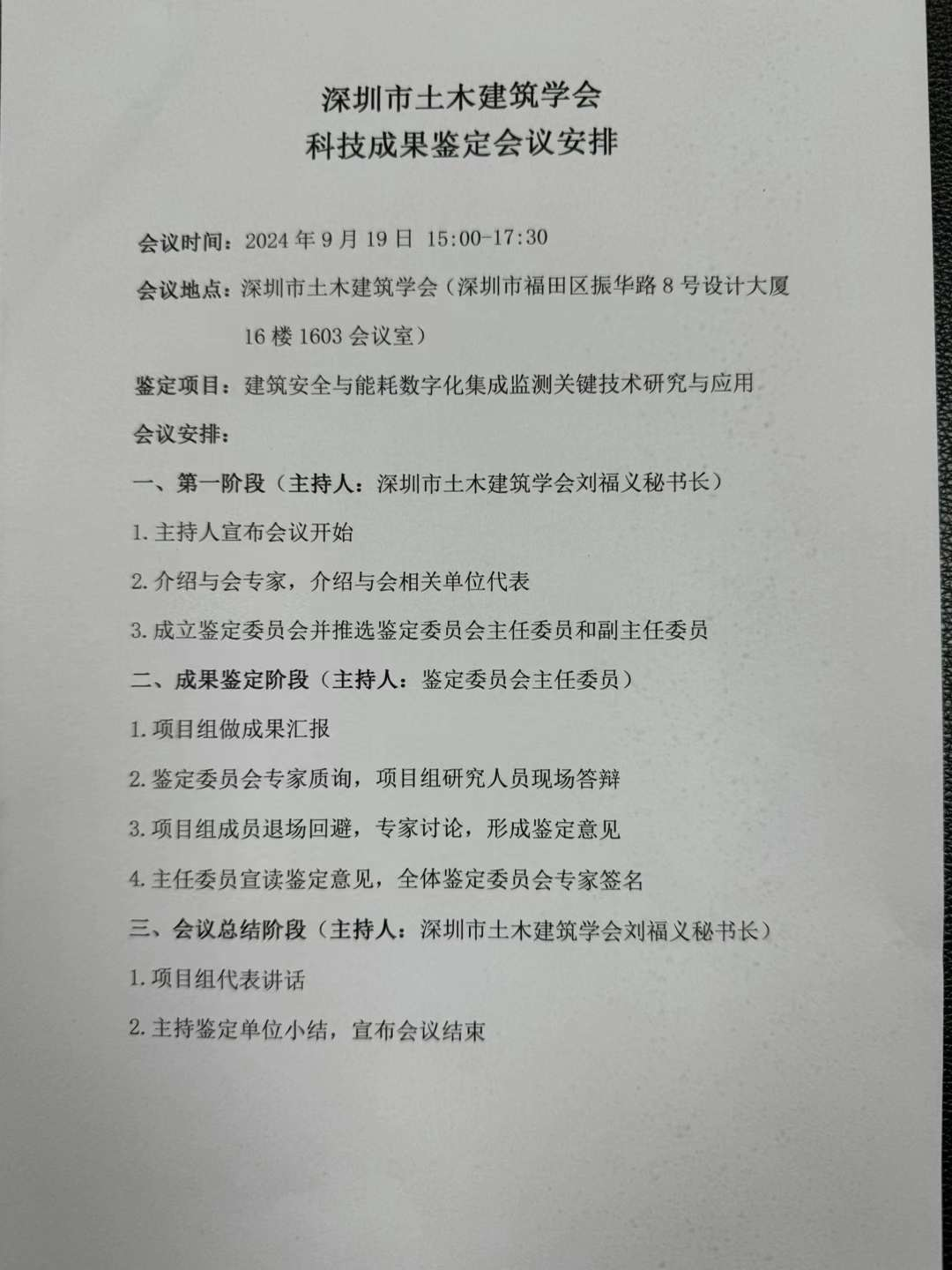 2024-9-19。中國建研院深圳分院“建築安全與(yu) 能耗數字化集成監測關(guan) 鍵技術研究與(yu) 應用”的評審會(hui) 在設計大廈舉(ju) 行。學會(hui) 劉福義(yi) 秘書(shu) 長做評審會(hui) 議的總體(ti) 安排,專(zhuan) 家組選舉(ju) 王啟文和隋慶海兩(liang) 位大師為(wei) 評審組的正、付主任。會(hui) 議經過匯報、谘詢、答疑,該項目最後被評為(wei) 國際先進。