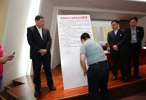 為(wei) 深入貫徹執行住建部、質監總局、工信部和深圳市政府關(guan) 於(yu) 推進建設工程質量提升,整治工程質量常見問題,提高建築防水工程質量的有關(guan) 精神,在紀念大會(hui) 上,由深圳防水合作組織成員深圳卓寶、深圳科順、深圳藍盾、深圳新黑豹、廣東(dong) 東(dong) 方雨虹、廣東(dong) 青龍、廣西金雨傘(san) 、江蘇凱倫(lun) 、濰坊宏源9家企業(ye) 舉(ju) 行了“深圳市防水行業(ye) 質量自律宣言”的簽字儀(yi) 式,深圳藍盾童祖元董事長代表9家企業(ye) 宣讀《深圳防水行業(ye) 質量自律宣言》,同時授予9家企業(ye) “深圳防水質量自律標杆企業(ye) ”稱號。深圳卓寶鄒先華董事長作為(wei) 標杆企業(ye) 代表講話,他向全社會(hui) 鄭重承諾,卓寶公司決(jue) 不生產(chan) 、不銷售、不使用一平米和一公斤非標材料,要以身作則,嚴(yan) 於(yu) 律己,為(wei) 深圳防水行業(ye) 健康發展作出表率。