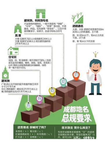 在高速城鎮化的衝(chong) 擊下,如何保護和傳(chuan) 承本土曆史地名?如何杜絕“洋名”和“怪名”?1月13日,成都市出台了“史上最嚴(yan) ”的地名總規,《成都市地名總體(ti) 規劃2015-2020》,將中心城區劃分為(wei) 16個(ge) 地名區塊,其中道路、公共空間、建築物等命名都要遵循具體(ti) 規則,接地氣,傳(chuan) 承曆史味兒(er) ,拒絕 “洋名”和“怪名”。