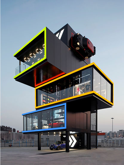 上海MINI品牌體(ti) 驗中心是全球首個(ge) MINI品牌體(ti) 驗中心,位於(yu) 上海世博園中。這個(ge) 獨特的建築物使用了典型的MINI品牌設計語言,采取了三維矩形結構,通體(ti) 黑色,鑲嵌彩色邊框,形成了高16米的“可遊覽的雕像”。三個(ge) 由鋼鐵框架固定的“黑盒子”向三個(ge) 方向錯落疊放,構成三層不同主題的功能空間。來訪者通過外部樓梯登上各個(ge) 空間,這裏還展示了MINI傳(chuan) 播與(yu) 品牌曆史。這種縱向結構不僅(jin) 讓建築引人注目,而且讓空間更為(wei) 緊湊,挑戰著人們(men) 對建築的既有預期。