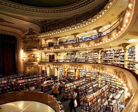 雅典人大書(shu) 店(阿根廷,布宜諾斯艾利斯)——躲過北麵照來的灼人陽光,走入聖菲大道上一幢白色的建築,這裏,便是浮雕玲瓏、金碧輝煌的大劇院。書(shu) 籍,與(yu) 愛書(shu) 客們(men) ,每日,都在這裏循環上演著新的劇目。