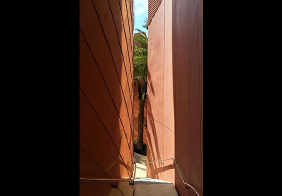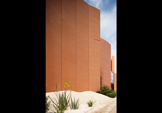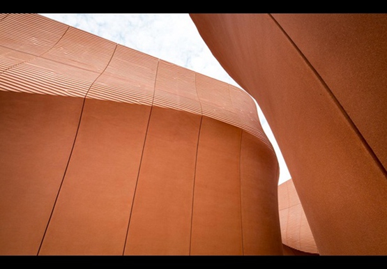 參觀者進入這個(ge) 長條形的展覽館,要通過一個(ge) 由兩(liang) 道12米高的牆構成的“峽穀”狀入口。這兩(liang) 道牆,繼續呈波浪形延伸,通過140米長的展覽館。