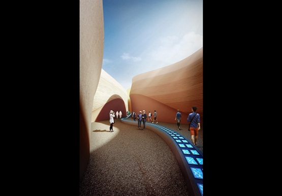 阿拉伯聯合酋長國的“峽穀”狀展覽館由鋼架支撐的玻璃纖維增強複合材料板建成。這樣設計的目的,是讓它能被拆卸,再用於(yu) 阿拉伯聯合酋長國的其他重要活動。麵板的紋理是根據阿聯酋沙漠拍攝掃描的。