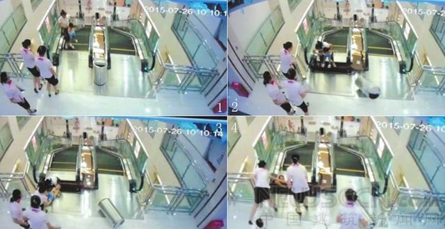 扶梯上部鐵板突然塌陷,女子最後一刻奮力將孩子推出。