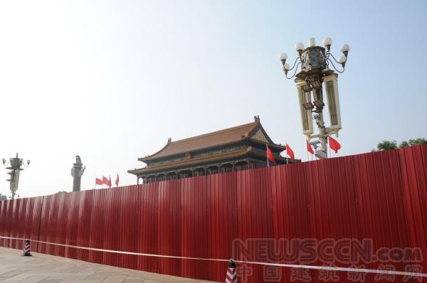 2015年8月9日,北京,天安門城樓前東(dong) 西兩(liang) 側(ce) 豎起了紅色圍擋, 開始搭建93閱兵式臨(lin) 時觀禮台,迎接抗戰勝利70周年紀念日的到來。