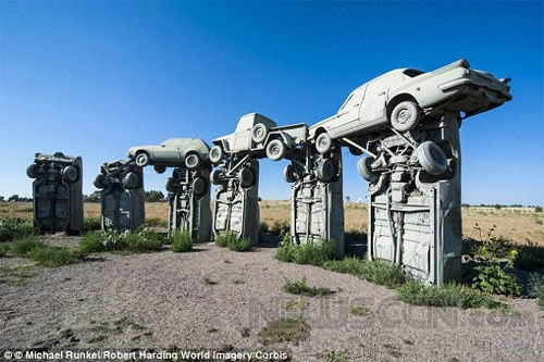 英國巨石陣的另一個(ge) 仿製品----美國內(nei) 布拉斯加州車陣。該車陣位於(yu) 美國西部邊緣沙丘,由吉姆?賴因德斯(Jim Reinders)用38輛舊車搭建而成,用以紀念他已逝的父親(qin)