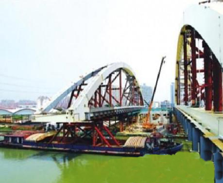該橋為(wei) 目前國內(nei) 采用浮拖法施工跨徑最大、重量最大的斜靠式鋼箱係杆拱橋。