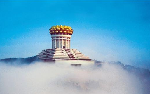 無論是白雲(yun) 藍天,還是雲(yun) 霧繚繞,你都能看到,會(hui) 稽山脈西北端、大香林寶林山的頂峰,有一座蓮花寶座,它就是兜率天宮,迄今浙江省內(nei) 的地標性建築。