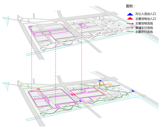 構建物流、辦公便捷的交通網絡係統、各功能流線清晰高效且互不幹擾,並能滿足不斷擴充的功能需求。