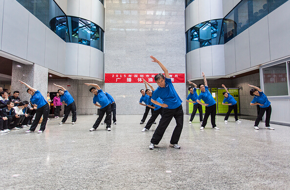 11月27日下午,我司第八套廣播體(ti) 操比賽在市政設計大廈主樓一樓大堂順利結束,至此,市政院2015體(ti) 育活動月係列活動圓滿收官。作為(wei) 體(ti) 育月的活動亮點,廣播體(ti) 操比賽吸引了來自各部門及下屬分(子)公司的16支參賽隊伍積極參賽。比賽特邀請集團公司黨(dang) 委副書(shu) 記、紀委書(shu) 記、工會(hui) 主席李笑竹,企管部部長鄒衛,以及市二醫院、市體(ti) 工大隊國家體(ti) 操隊、工商銀行黃木崗支行的有關(guan) 領導擔任評委。活動現場氣氛格外熱烈。