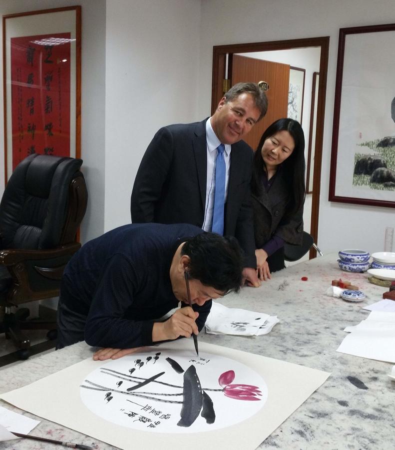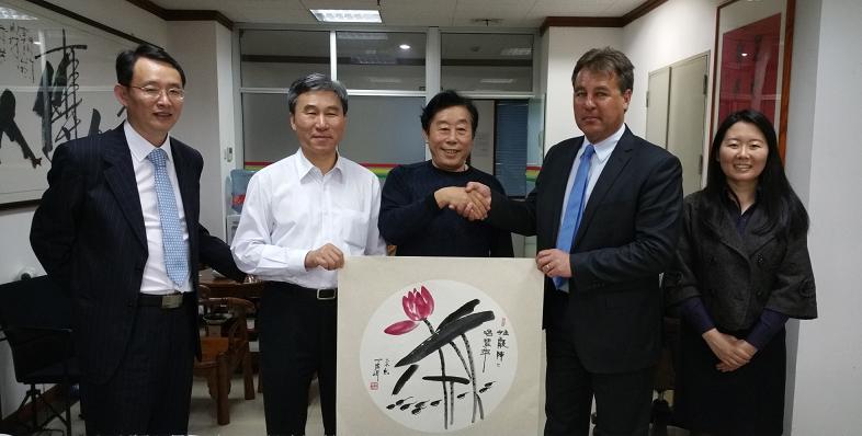 2015年4月9日,國際區域氣候行動組織(R20)執行總監克裏斯托弗·那濤博士在深圳市國際低碳發展研究院王東(dong) 院長陪同下到我司訪問。我司陳宜言董事長、張健君副總經理、陳少華主任、黃立博士會(hui) 見了那濤博士並進行友好會(hui) 談。雙方分別介紹了各自特點,以及在城市節能環保、低碳減排等方麵所做的努力,探討了合作的可行性,表示今後將加強溝通,共同推動節能、低碳項目的開展。會(hui) 談在輕鬆愉快的氣氛中進行,其間陳宜言董事長向客人介紹了中國茶道和書(shu) 畫藝術,引起了那濤博士對中國傳(chuan) 統文化極大興(xing) 趣。會(hui) 後,那濤博士參觀了我司辦公環境,聽取了有關(guan) 家長懇談會(hui) 、拜師禮、軍(jun) 訓等企業(ye) 文化介紹。國際美聯副主席丁廣瑋先生還現場揮毫潑墨為(wei) 那濤博士創作了一幅荷花作為(wei) 禮物相贈。
