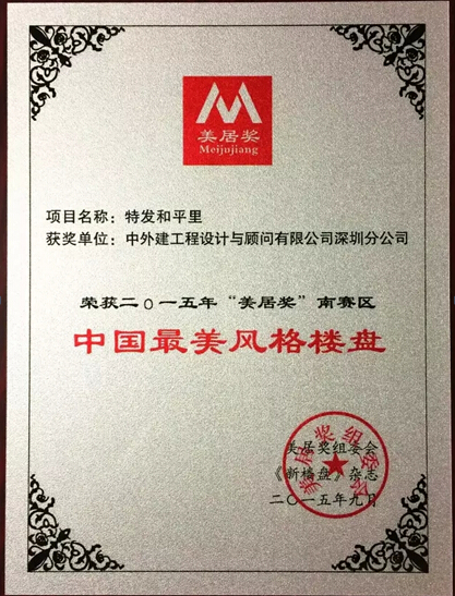 2015年9月18日,由新樓盤雜誌舉(ju) 辦的2015年度“美居獎”南賽區頒獎典禮在深圳格蘭(lan) 雲(yun) 天酒店舉(ju) 行。中外建深圳公司與(yu) 深圳市特發集團有限公司合力打造的“特發和平裏”脫穎而出,奪得“2015年度最美風格樓盤”大獎。