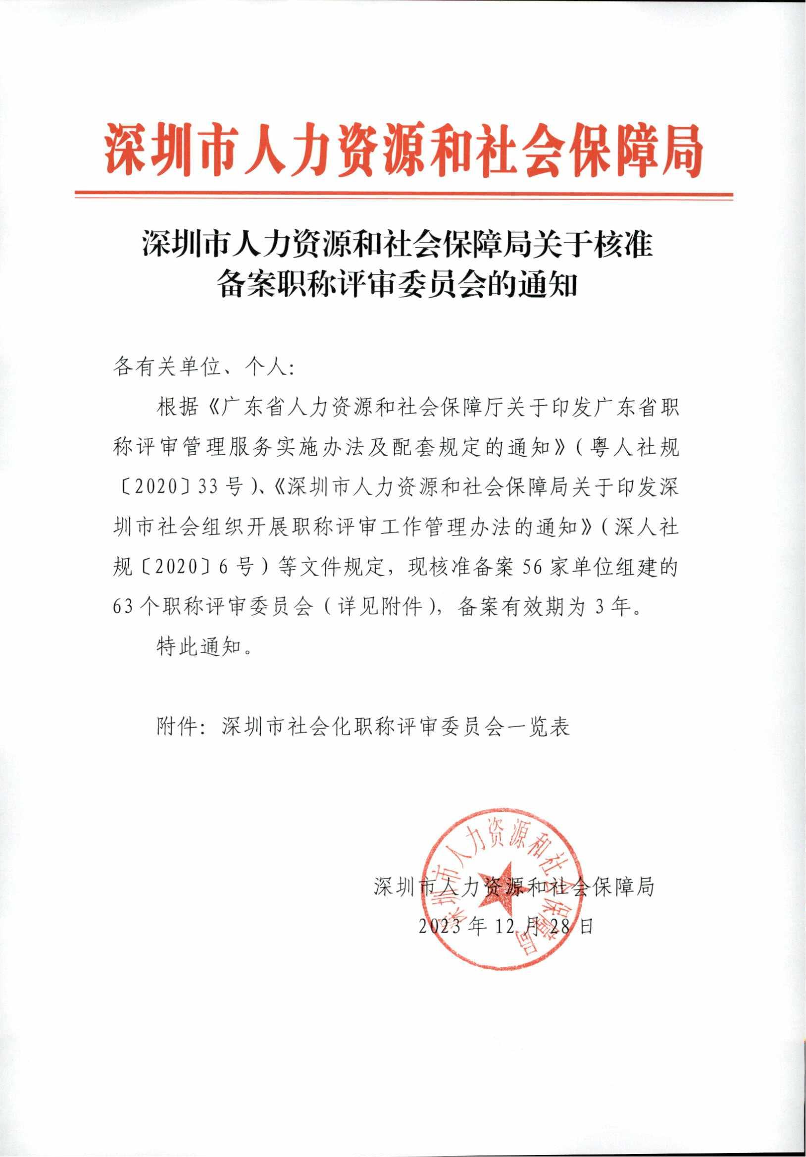 深圳市人力資源和社會保障局關於核準備案職稱評審委員會的通知
