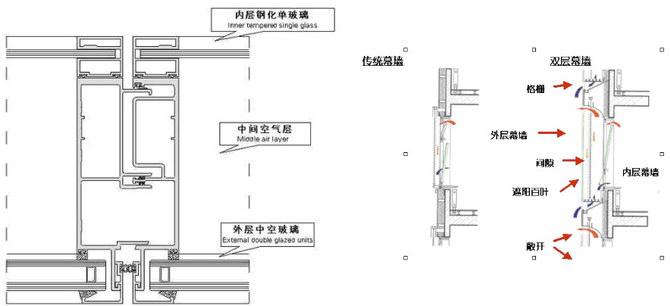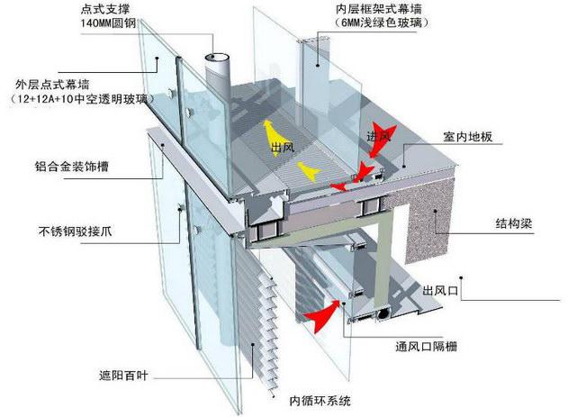 內(nei) 外幕牆之間形成一個(ge) 相對封閉的空間。其下部有進風口,上部有排風口,可控製空氣在其間流動狀態。設有可控製的進風口、排風口、遮陽板和百葉等。利用氣壓差、熱壓差和煙囪效應的原理使雙層幕牆之間的空氣可有序流動和交換。 雙層幕牆包括幕牆外層、幕牆中部空間和幕牆內(nei) 層,其中表麵外層抵製天氣的變化並提高隔聲能力。