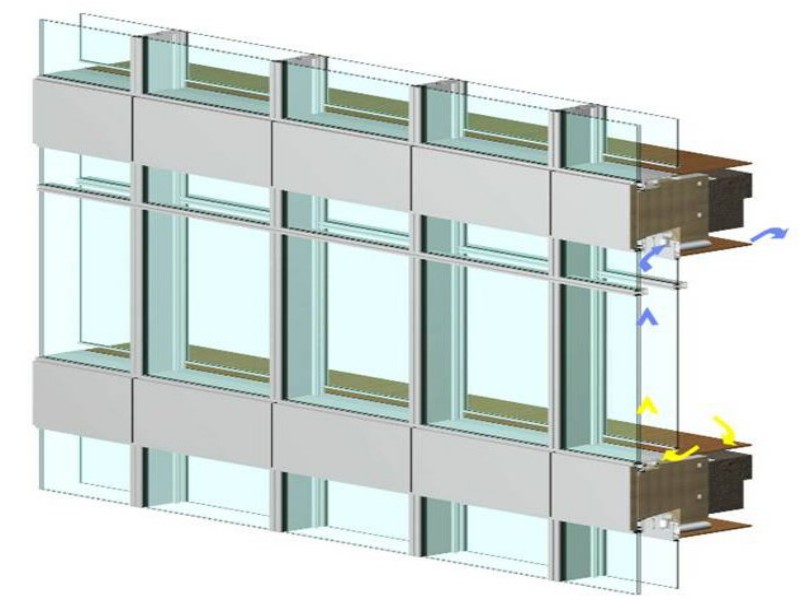 外層幕牆采用中空玻璃、隔熱型材形成封閉狀態。內(nei) 層幕牆采用單層玻璃或單層鋁合金門窗,成可開啟狀態。利用機械通風,空氣從(cong) 樓板或地下的風口進入通道,經上部排風口進入頂棚流動。